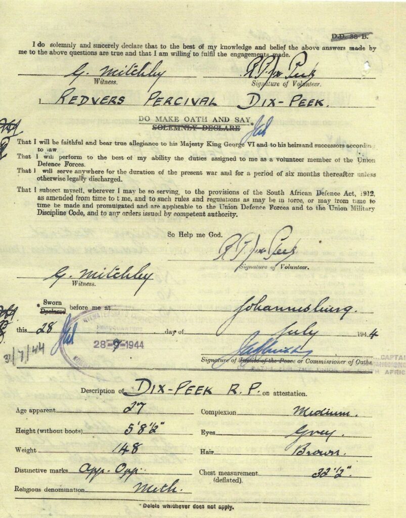 It s noted that Redvers only attested for military service in 1944 when he was 27 years old. Unlike most other men who attested as soon as they completed their schooling, in his case the war had already been in progress for 5 years. I wonder what the reason was for the delayed singing-up? Could it have been a mundane reason such as the quantum of the remuneration or it could have been for medical reason such as poor eyesight. Presumably if this had been the case, by 1944 the standards would have been relaxed as replacement manpower was urgently required.
