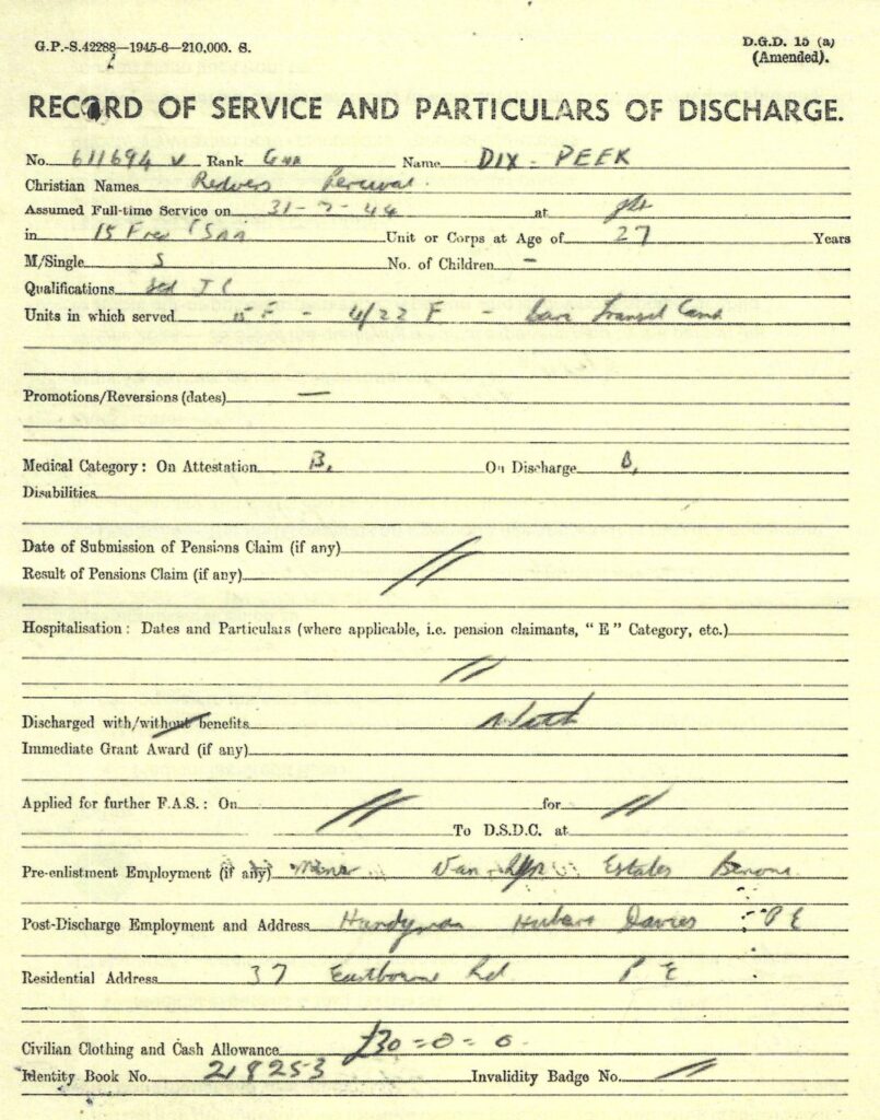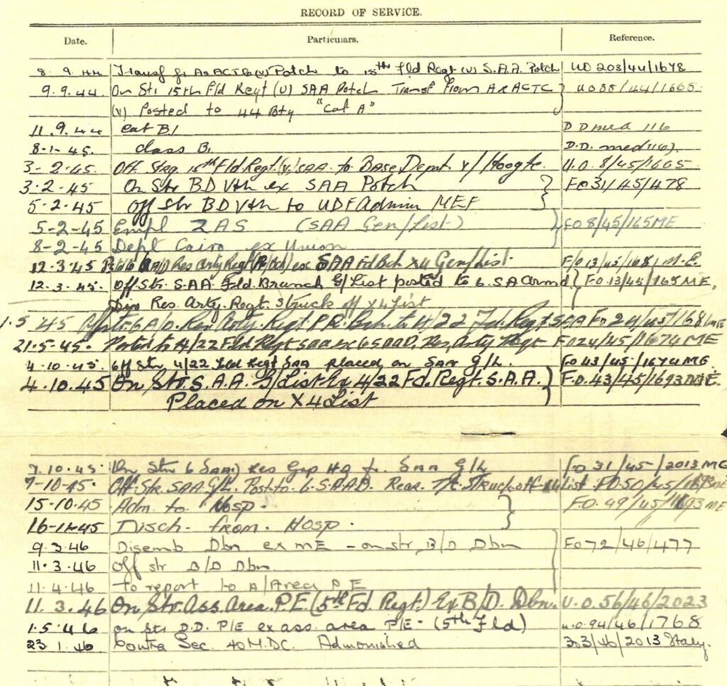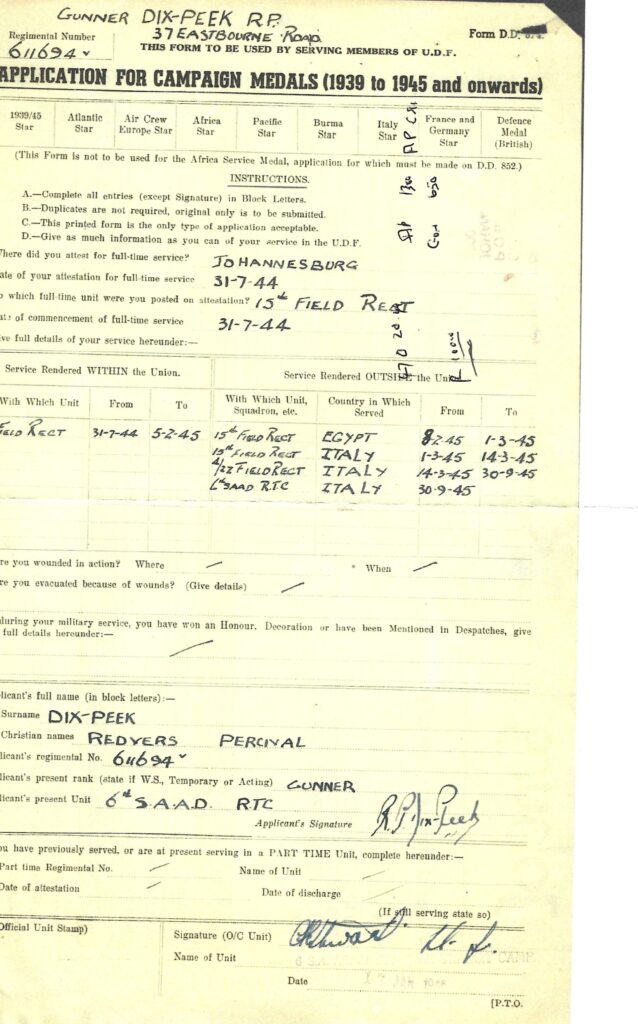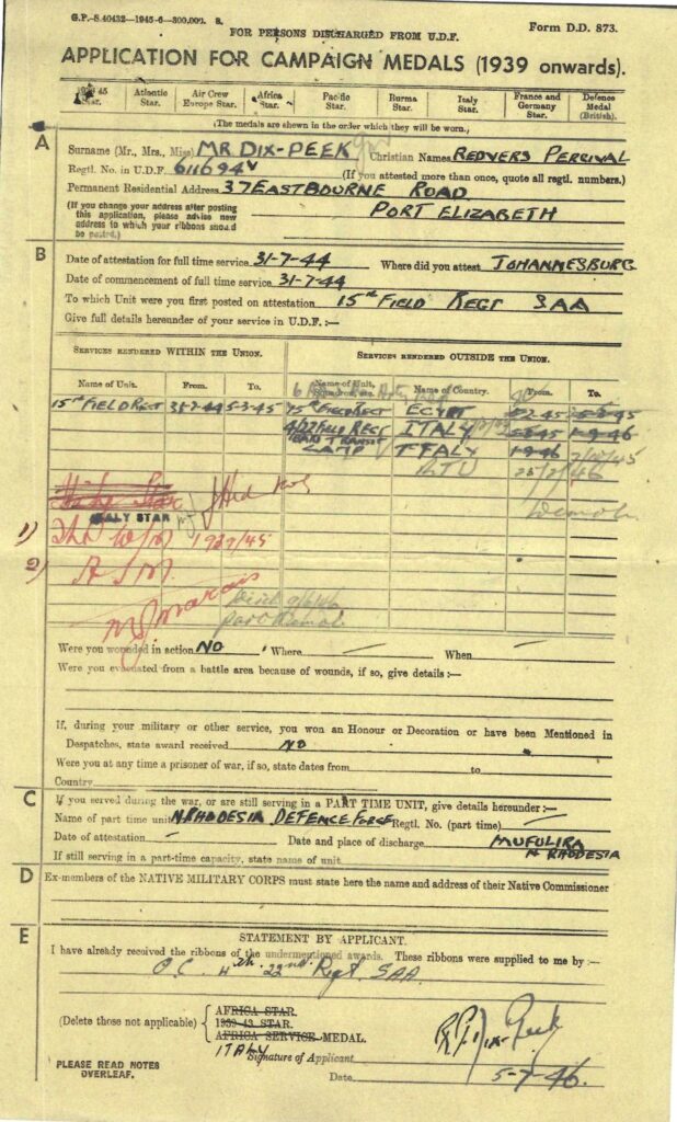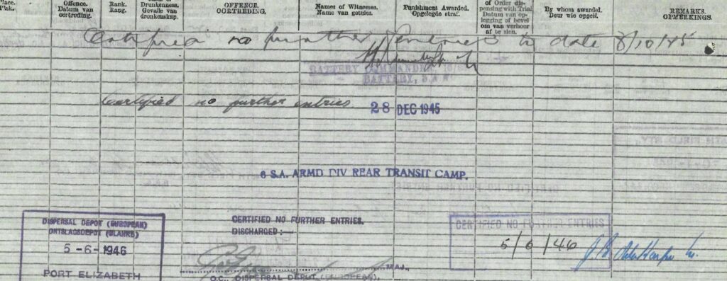 Redvers attested for service on the 28th July 1944 in Johannesburg at the age of 27 years and on the 8th September 1944 he was transferred to Potchefstroom to commence training with the 15th Field Regiment with a posting to Battery no 44 after completion of his training. On the 3rd February 1945, Redvers was transferred to the base depot at Voortrekker Hoogte, and then on the 8th February, Redvers departed for Cairo. A month later he was posted to the 6th Armoured Division, South Africa’s only active unit at the culmination of WW2. On the 7th October 1945 Redvers reported sick, being admitted to hospital 8 days later. Finally he was discharged on the 16th November 1945. Shipped back home, Redvers disembarked at Durban on the 9th March 1945.