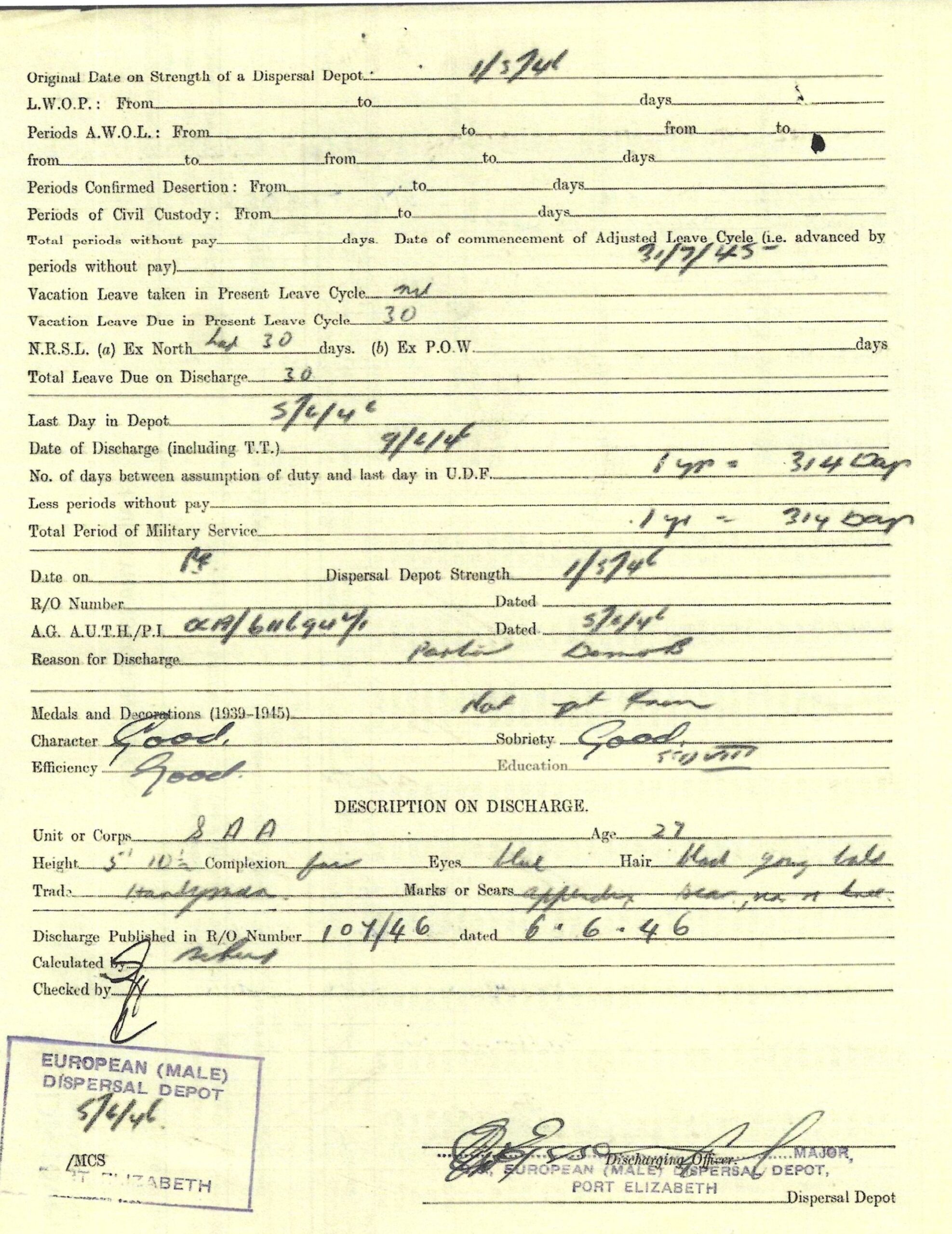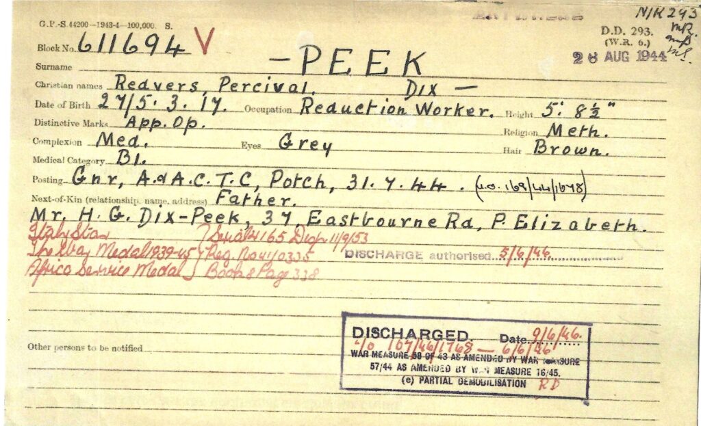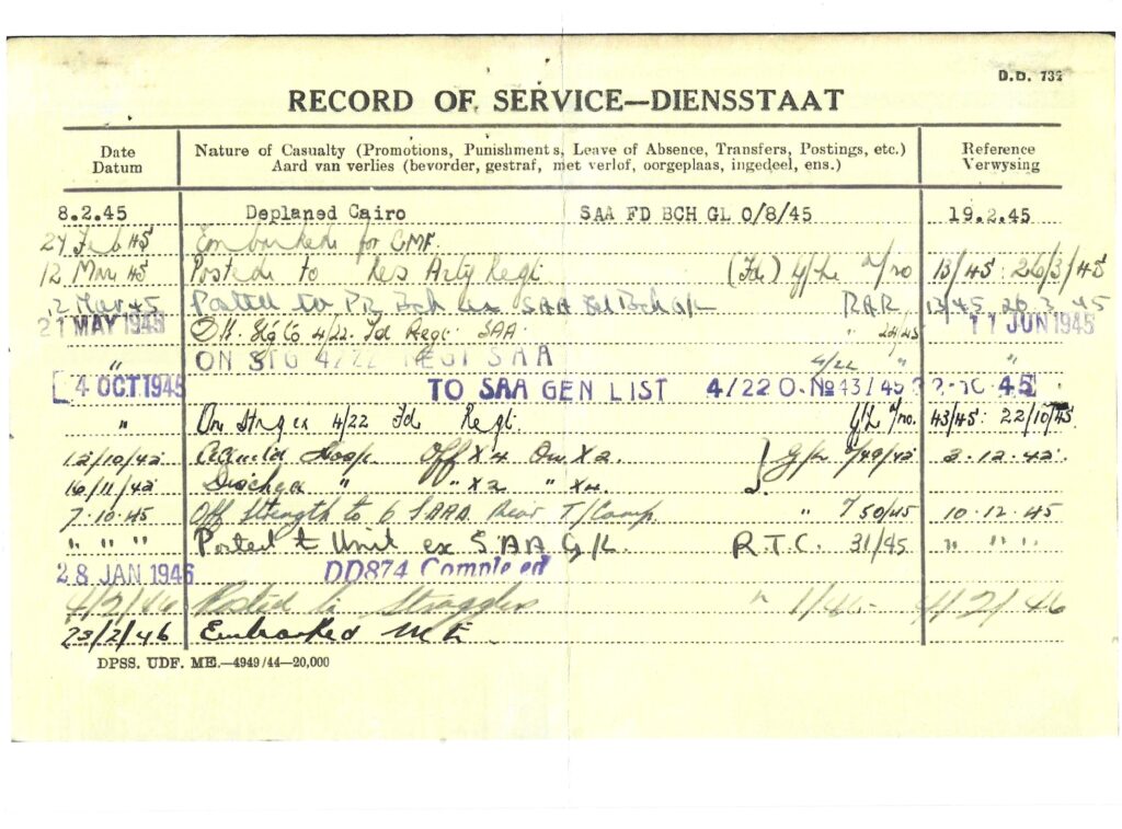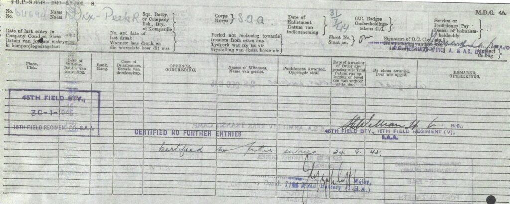 Redvers attested for service on the 28th July 1944 in Johannesburg at the age of 27 years and on the 8th September 1944 he was transferred to Potchefstroom to commence training with the 15th Field Regiment with a posting to Battery no 44 after completion of his training. On the 3rd February 1945, Redvers was transferred to the base depot at Voortrekker Hoogte, and then on the 8th February, Redvers departed for Cairo. A month later he was posted to the 6th Armoured Division, South Africa’s only active unit at the culmination of WW2. On the 7th October 1945 Redvers reported sick, being admitted to hospital 8 days later. Finally he was discharged on the 16th November 1945. Shipped back home, Redvers disembarked at Durban on the 9th March 1945.