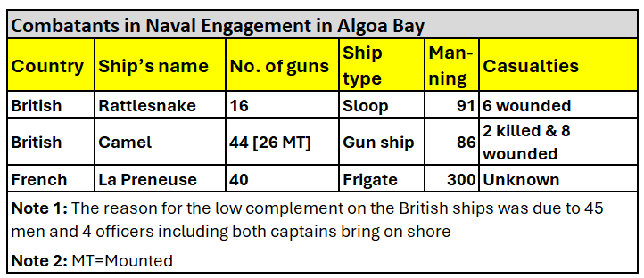England had only captured the Cape four years previously in 1795. Both British ships had their gallant masts on deck, their top masts and most yards lowered. From both ships 45 men and 4 officers including both Captains were on the shore with the army. Therefore the Rattlesnake and the Camel only had 91 and 86 men respectively aboard their ships. With their captains on the shore probably enjoying a relaxing braai on the seashore, the naval battle would be under the command of First Lieutenants Fothergill and Shaw.