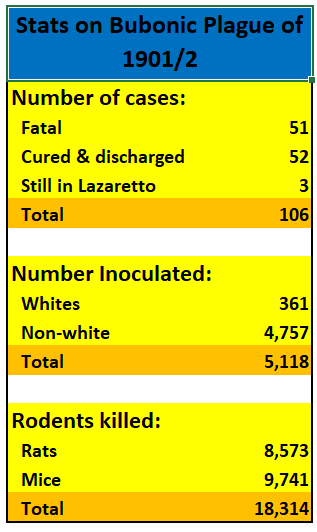 By February 1902, the outbreak had virtually ended though the official end was only in August of that year. In reports to the Board in February Dr. Rees stated that there had been 106 cases, 51 fatal, 52 cured and discharged from the Lazaretto and 3 still there under treatment. Thus there was a 48.1% mortality rate. 361 Europeans and 4757 blacks and coloureds, totalling 5118 people were inoculated. 8573 rats and 9741 mice were destroyed.